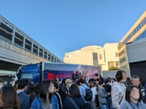 途中のグッズトラック前は激混み。万博以来の人の多さに圧倒されました。