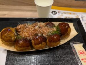 パスタ・ピザ・中華・ラーメン、どんぶり…と、どれも重い。端っこにマリオンクレープはありましたが、ランチに甘い物はいいかな、と結局、安定の築地銀だこを選択。
